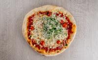 mozzarella fior di latte, pelati, por, paprika, bučke, rukola, parmezan