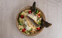 pernata solata, gorčični preliv , vok zelenjava, sir na žaru (Alergeni: ml.izdelki, jajca, gluten, gorčica, ribe, sledovi vseh alergenov)