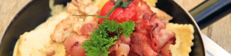 Polnjeni ravioli v curry omaki s piščančjimi rezinami in slanino